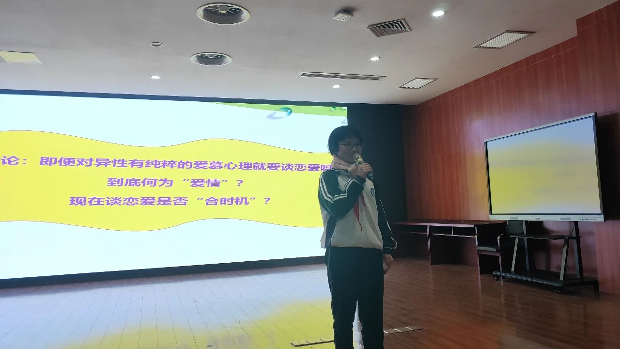 温老师抛出三个问题“即便对异性有爱慕心理就要谈恋爱吗?”“何为爱情?”“现在谈恋爱是否“合时机”?”让同学们展开热烈讨论,将现场推到最高潮,接着温老师诠释了爱情的含义,结合案例表明了男女生之间广泛的异性交往是纯洁而美好,对人生有重要积极的意义,强调把握异性交往的尺度,由于青春期的双高峰而产生的性冲动导致一些过早性行为对生理、心理健康的危害。希望同学们学会等待,延迟满足,同时通过广泛的异性交往练习爱人的能力,学会保护自己,为自己和为他人负责。同时强调同学们要自尊自爱、遵守性道德、培养积极向上的生活方式是预防艾滋病的根本措施。