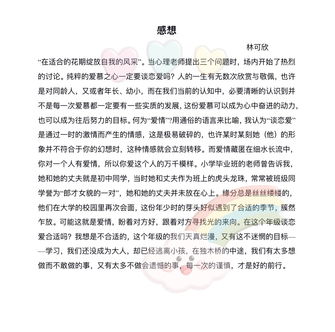 我们用巧妙的方式揭开了青春期的神秘面纱,了解了青春期的“秘密”,懂得了如何正确对待自己生理和心理的变化,学会了保护自己,做一个自信快乐的少年。把握好豆蔻年华,让我们一起从容走过这美好青春期,明艳绽放!